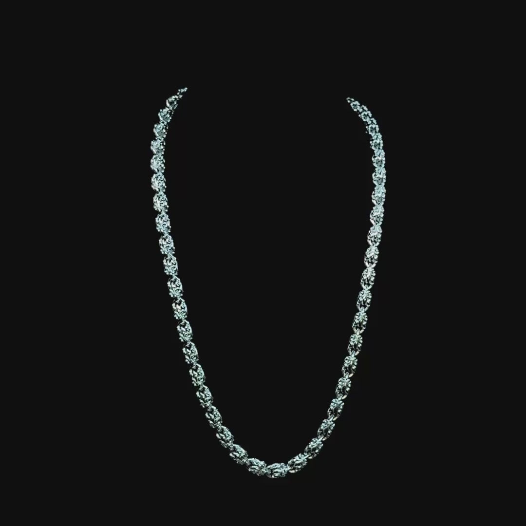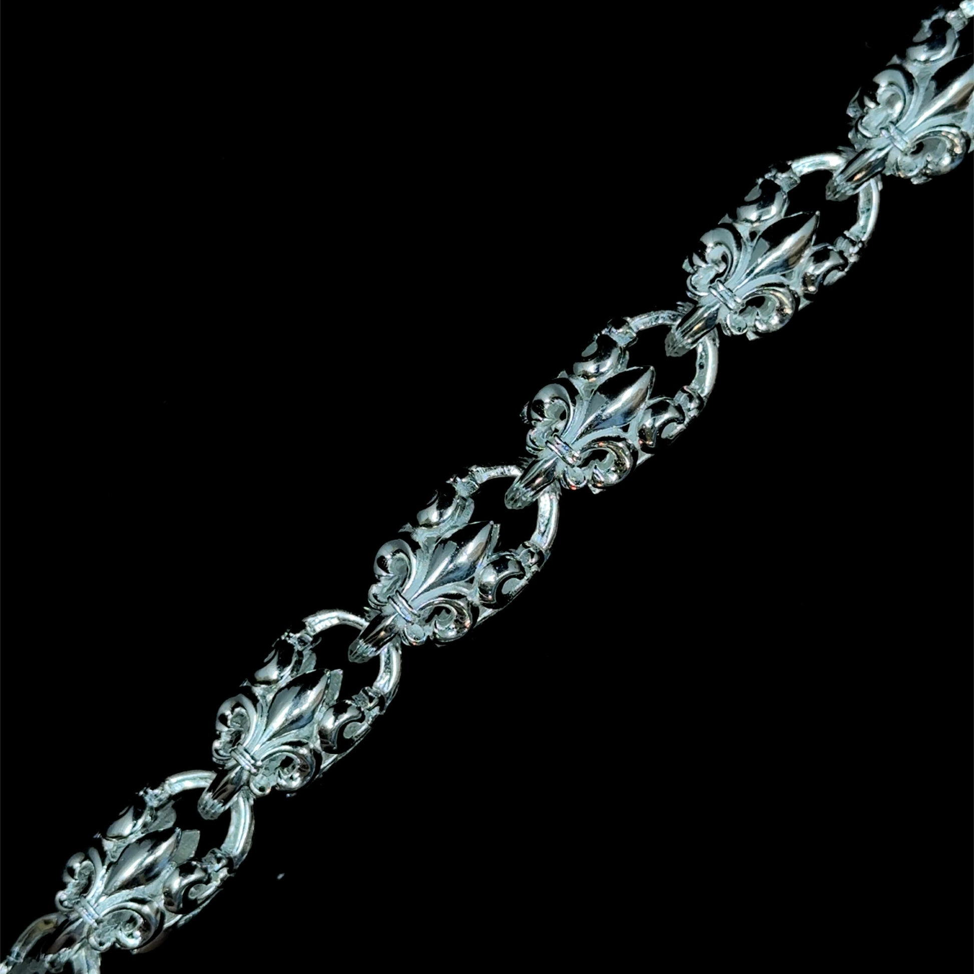 A refined, artisanal chain featuring intricate Fleur-De-Lis links symbolizing strength, unity, and prestige. Handcrafted from solid sterling silver and finished in fine silver for a clean, pure silver appearance. Designed without a clasp for a continuous, elegant flow, combining timeless artistry with bold craftsmanship.