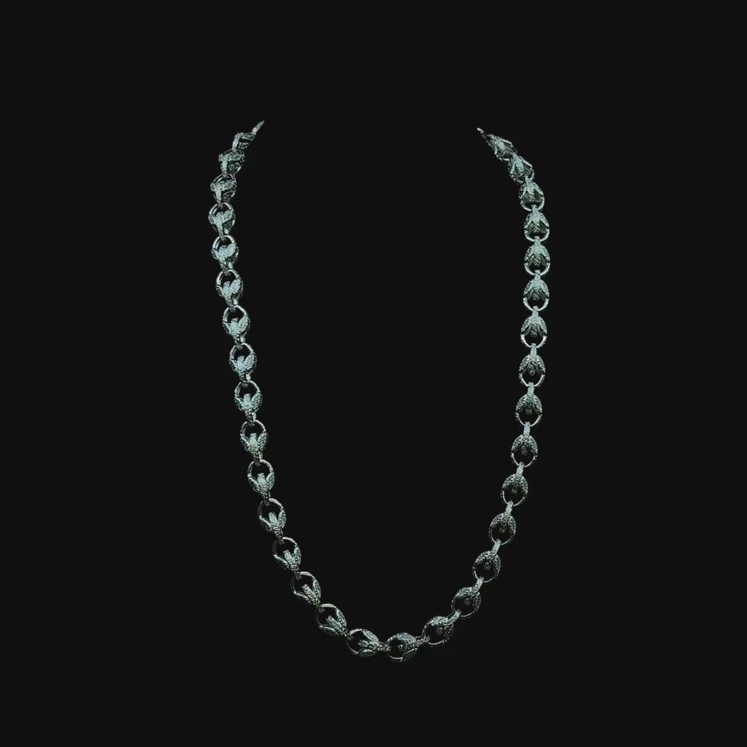 A striking, handcrafted chain showcasing ornate tulip-inspired links, symbolizing elegance and renewal. Each link is individually sculpted in solid sterling silver and finished in fine silver for a clean, pure silver appearance. Designed without a clasp for a seamless flow and bold visual rhythm, blending detailed artistry with timeless sophistication.